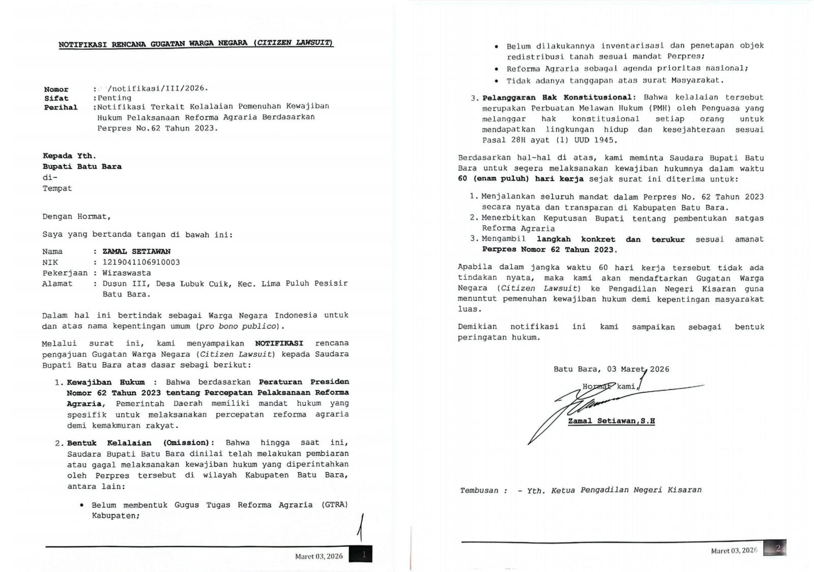 Ia bersiap mendaftarkan Gugatan Warga Negara (Citizen Lawsuit) secara resmi ke meja hijau Pengadilan Negeri Kisaran. Tujuannya hanya satu: menuntut pemenuhan kewajiban hukum penguasa demi tegaknya keadilan dan kepentingan masyarakat luas di Batu Bara.