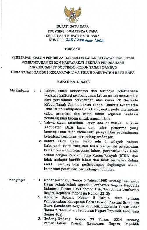 Jangkau.com – Batubara: Penerbitan Keputusan Bupati Batu Bara Nomor 228/DISTANBON/2024 menuai kritik tajam karena dinilai salah alamat dan secara mendasar mengabaikan amanat Undang-Undang (UU) Cipta Kerja. Alih-alih memfasilitasi masyarakat di lingkar perkebunan PT SOCFINDO, program tersebut justru dialihkan ke kelompok tani di kecamatan lain yang lokasinya lebih jauh, sehingga mencederai rasa keadilan dan menimbulkan pertanyaan serius mengenai kepatuhan hukum pemerintah daerah.